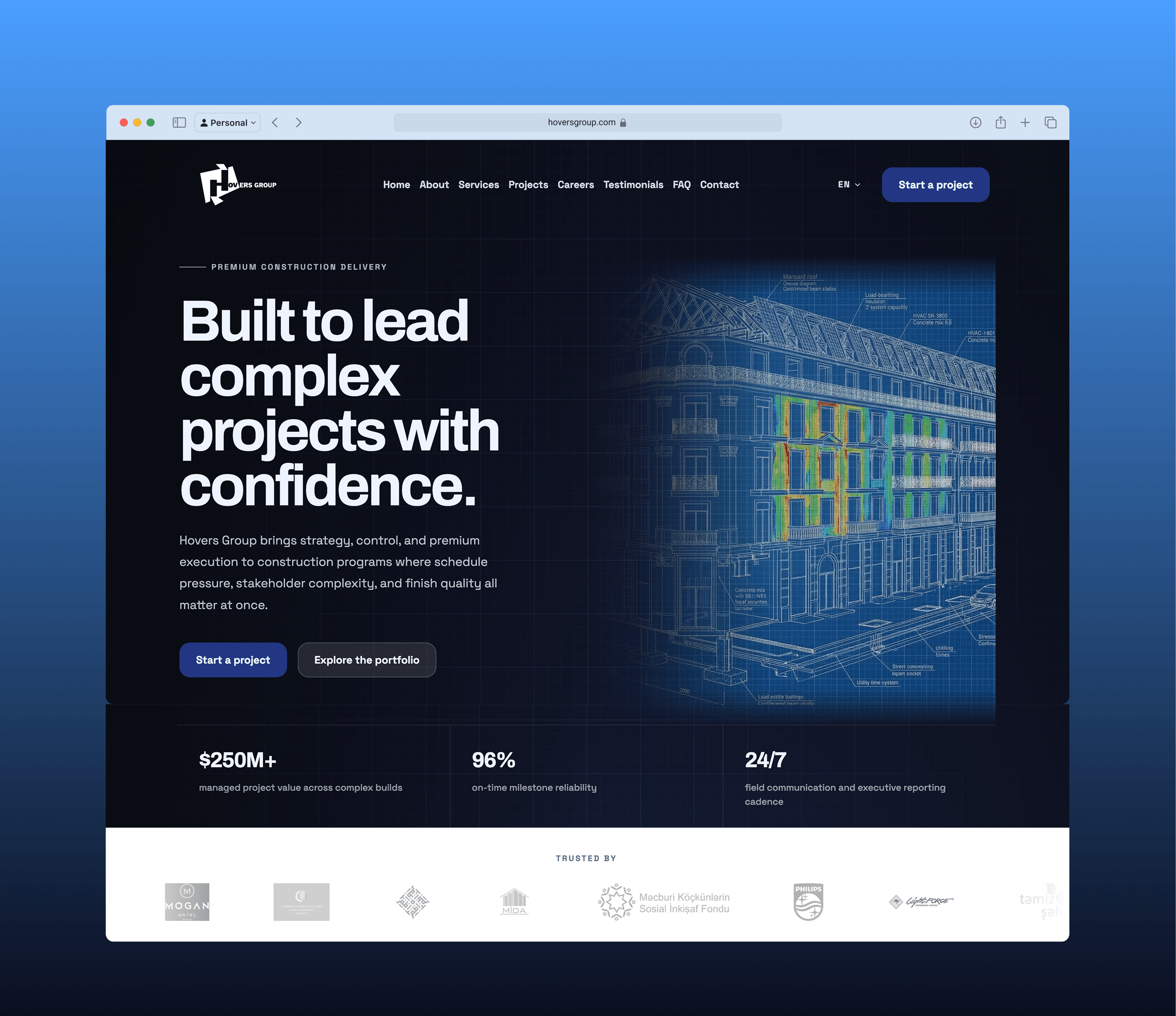 Construction buyers at this tier do not convert on a website — they qualify on it. The page had to give a sophisticated reader enough signal in two scrolls to decide whether Hovers Group belonged on the shortlist. That meant leading with capability and evidence, not aspiration.