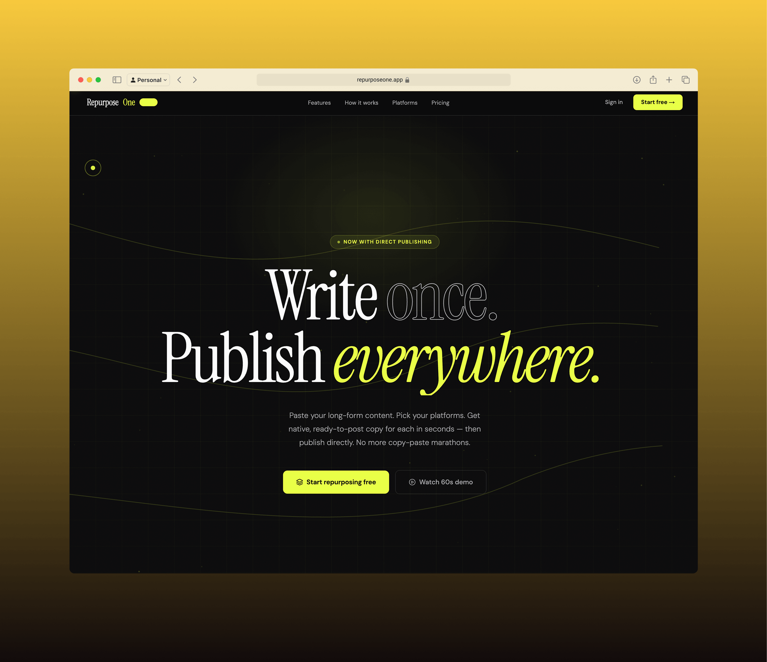 The redesign of the RepurposeOne website was tasked with matching the product's precision and confidence. The previous design undersold what the platform could do. The goal was a site that speaks directly to working creators — the ones who already know the problem — and gets out of the way fast.