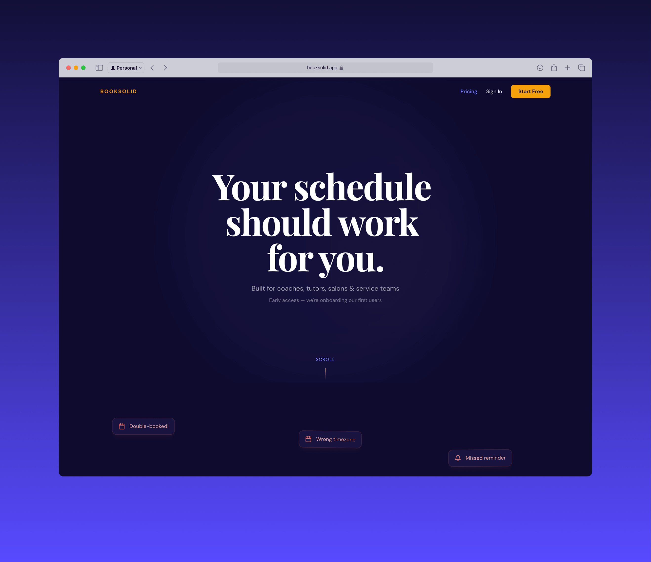 The website's job is to communicate, in the first scroll, that BookSolid is not another generic calendar tool. The audience — salon owners, tutors, fitness studios, coaches — is fluent in scheduling pain and immediately tunes out abstract software copy. The site had to lead with the operational result: fewer no-shows, less admin, more revenue captured.