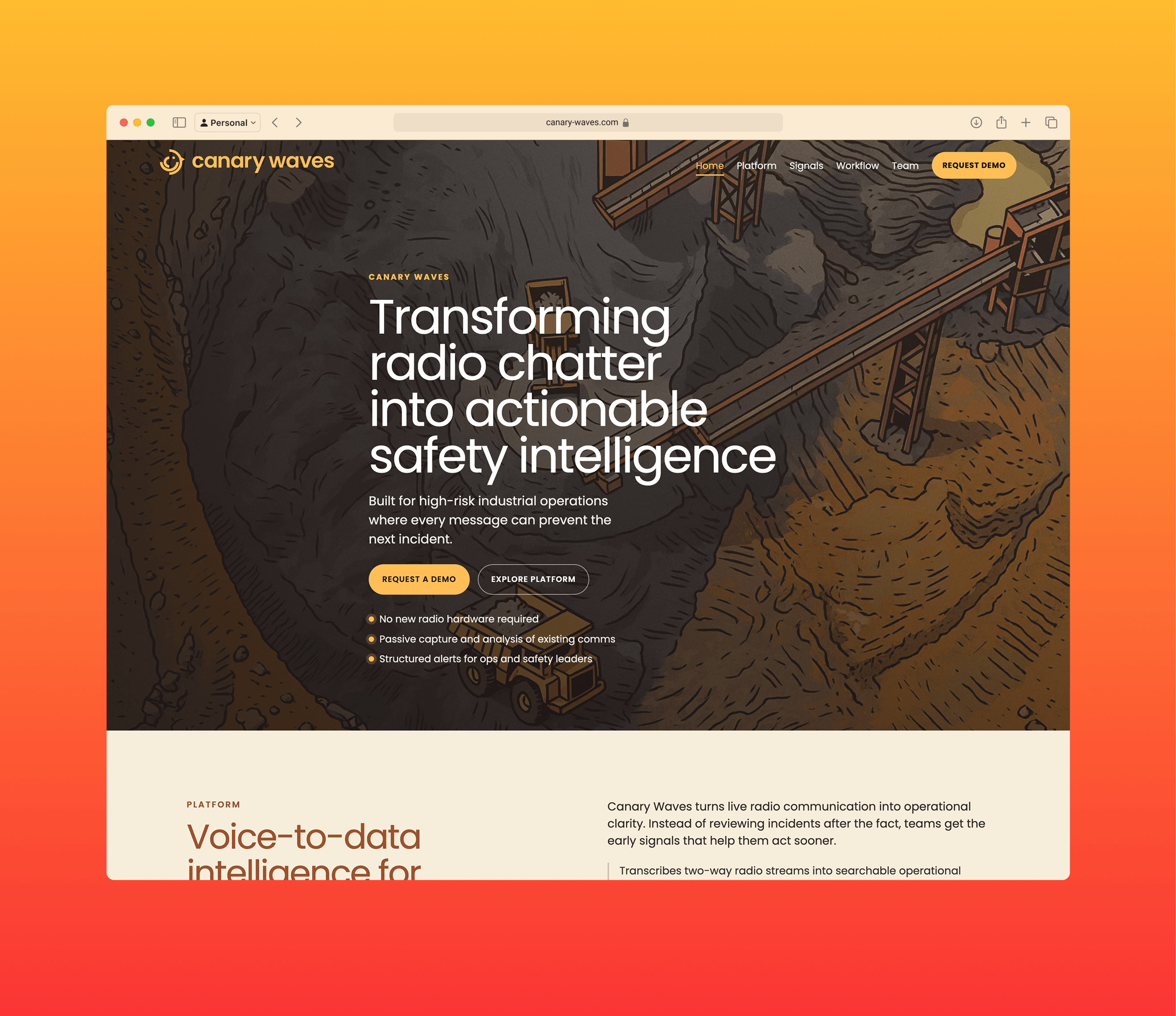 The redesign started with the positioning problem. Canary Waves operates at the intersection of AI, voice technology, and industrial safety, three domains that each carry their own jargon and expectations. The site needed to feel credible to operations leaders who have spent decades on mine sites, not like a typical SaaS landing page.