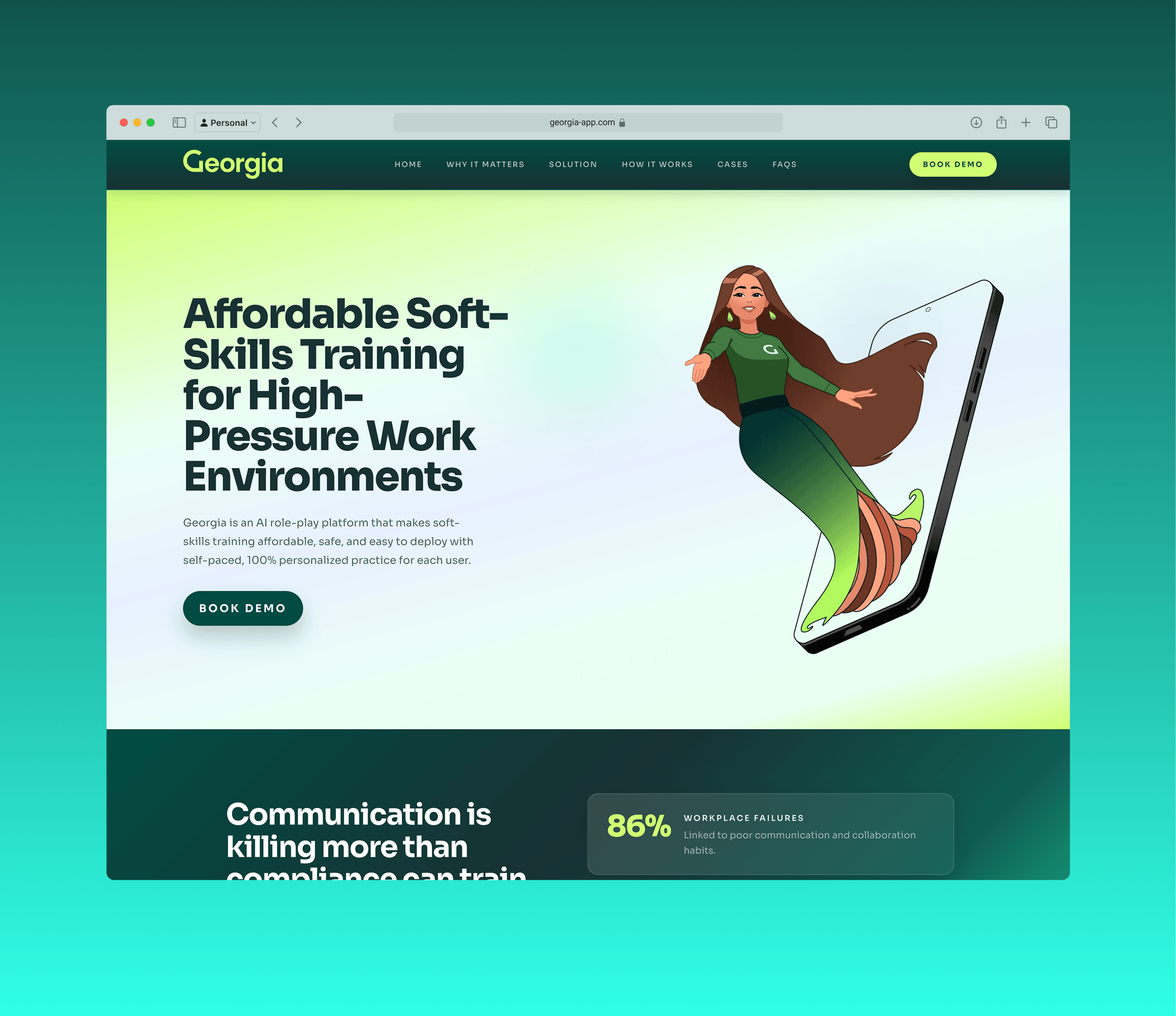 We structured the page around the communication problem first, making the case that miscommunication is a measurable business risk before introducing Georgia as the solution. Once the problem was established, the product explanation followed naturally: this is how practice works, this is what feedback looks like, this is why AI makes it more consistent and more accessible than coaching.